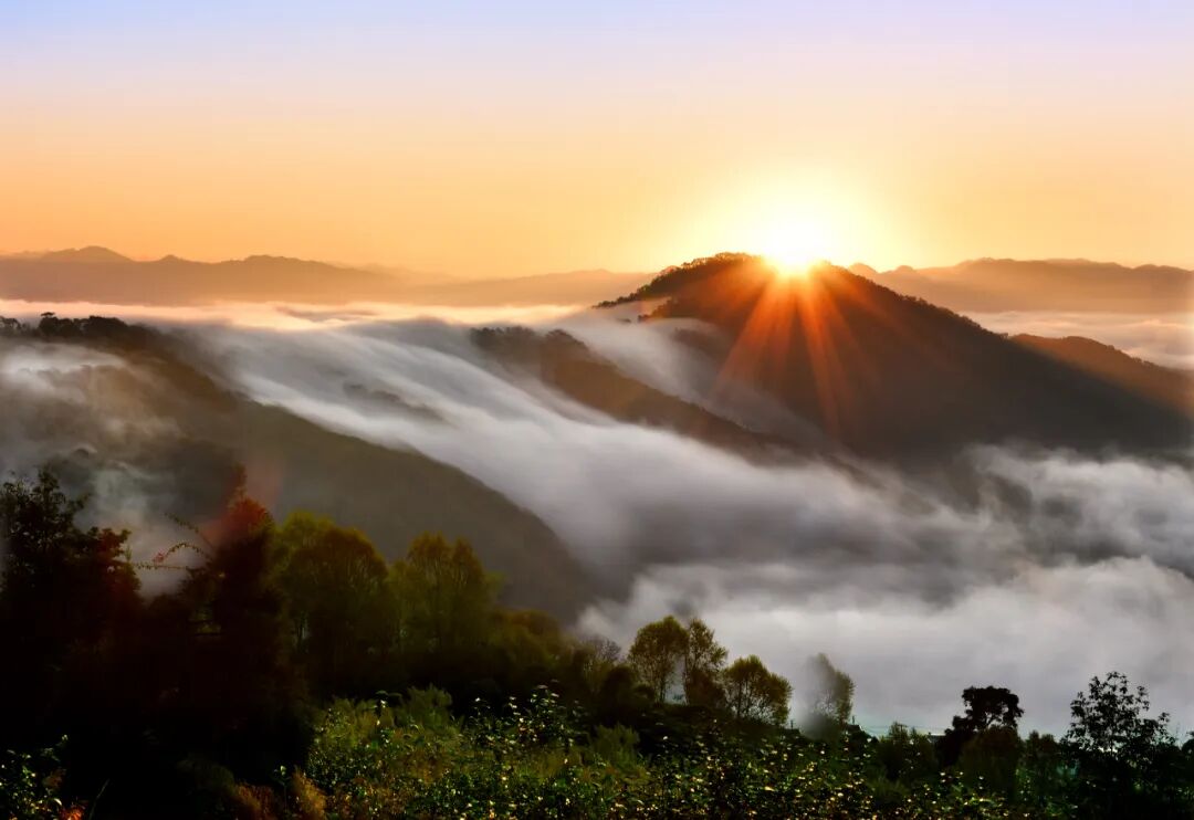 这里的云会跳舞,花会着墨。当日出邦东,金光灿灿的云海,如万马奔腾,气势磅礴,又似仙女翩翩起舞,飘逸出尘。凤庆云上花海,花在云上开,云从脚下来,云朵片片,浅淡相宜,远处的勐佑村,若隐若现,是记忆中故乡的模样。