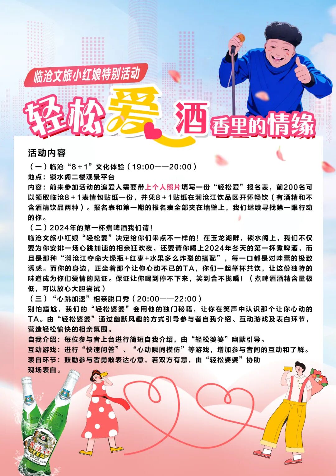 想象一下,在临沧的璀璨夜色中,你站在锁水阁二楼的观景平台上,俯瞰整个城市的灯火阑珊。这一次,我们不仅仅是观光,更是深入体验临沧的“8+1”文化!带上你的个人照片,填写一份“轻松爱”报名表,即可领取专属的临沧8+1表情包贴纸,全场醇厚的煮啤酒免费喝!或选择澜沧江集团旗下的其他美味饮品。每一份贴纸都承载着临沧的文化与你的情感,让你在寻觅心动对象的同时,也感受到临沧的深厚底蕴。