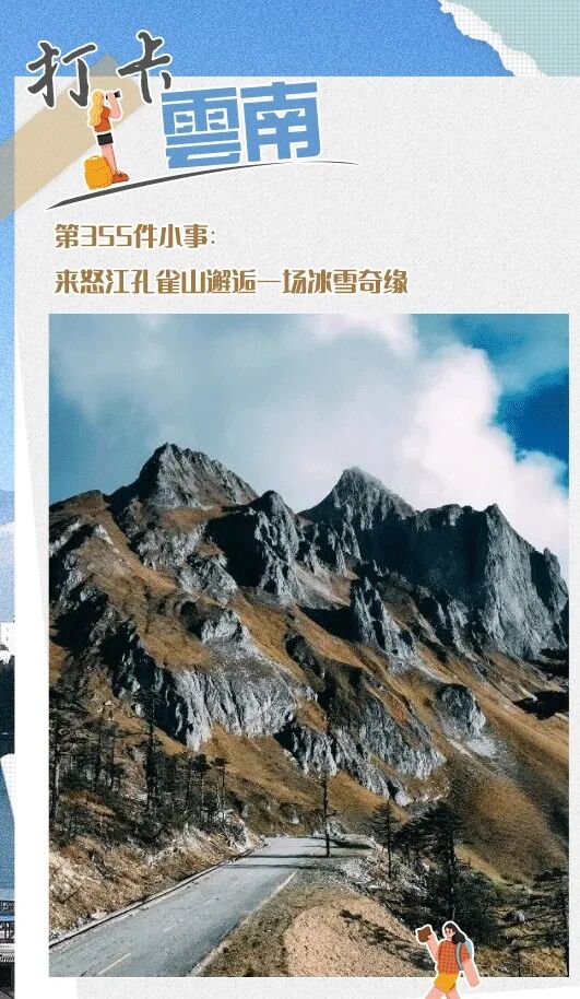 孔雀山位于云南省迪庆州德钦县与怒江州贡山县交界处,因仿若一只展翅欲飞的孔雀而得名。仲冬时节,怒江孔雀山被冬雪渲染成了银装素裹的仙境。孔雀山温柔而宁静,像是玫瑰轻纱半遮面的少女,等着旅人来邂逅一场冰雪奇缘。