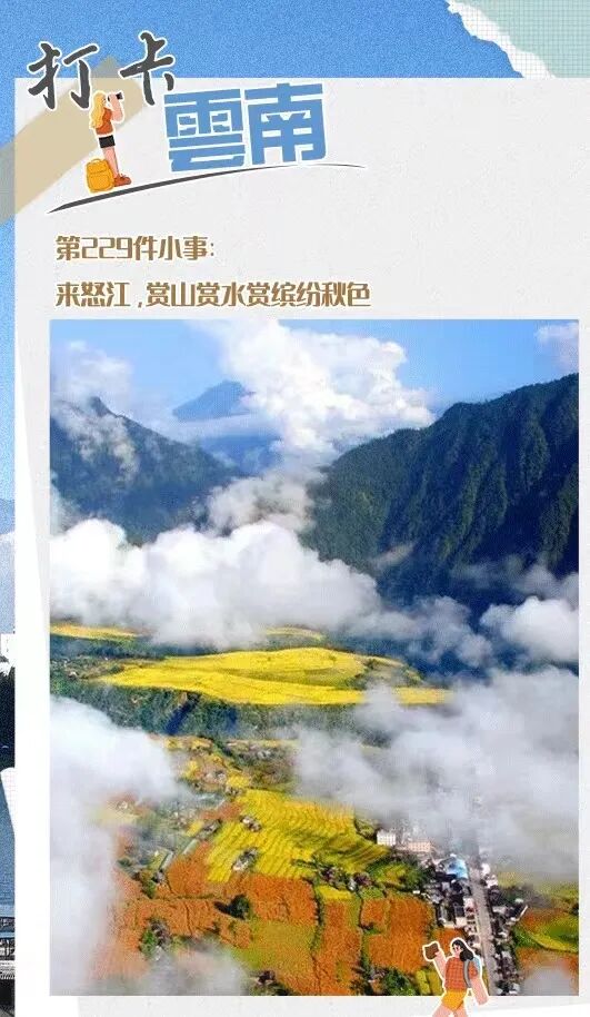 进入秋天,怒江的颜色就要褪去青绿,山谷渐渐换上金黄色的外衣。入秋,怒江峡谷的山峦更显雄伟壮观,呈现出迷人的色彩,这是大自然的一幅精心绘制的画卷。当秋风拂过,林间的树叶由青翠转为金黄、橙红,高山上的树木更是将这片天地变成了一幅美不胜收的绝妙画卷。
