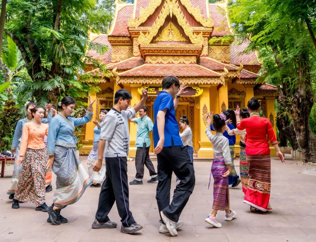 与孩子一起来到傣王行宫换上傣装,通过“曼听·春欢”傣王室传统礼仪课堂,和礼仪老师一起学习傣族传统礼仪、傣语、傣族歌舞。