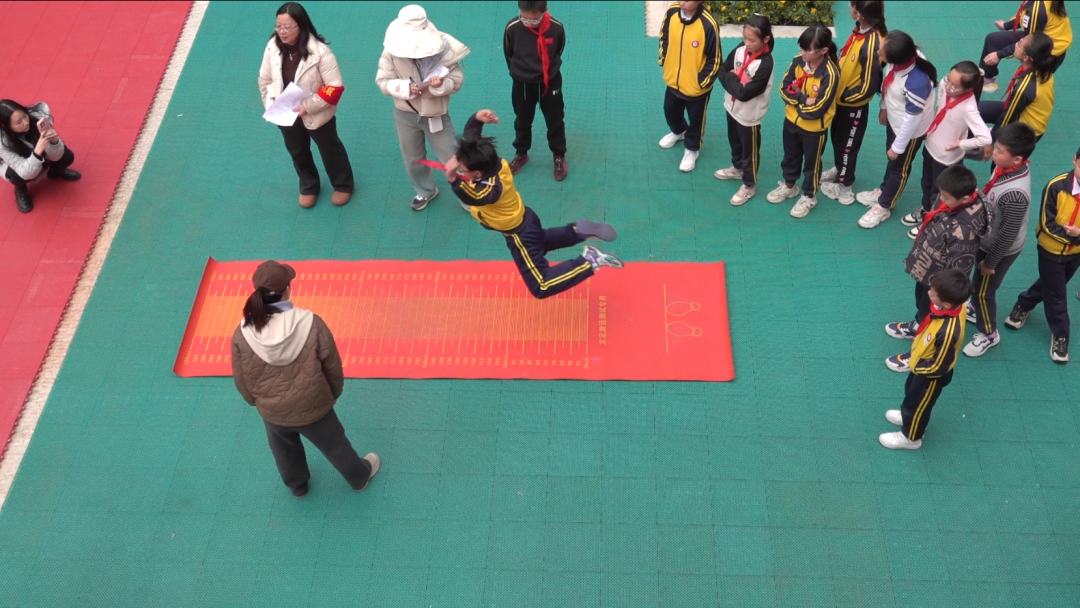 立定跳远项目中,选手们在起跳线前蓄势待发,随着一声令下,他们奋力一跃,在空中划出一道优美的弧线。