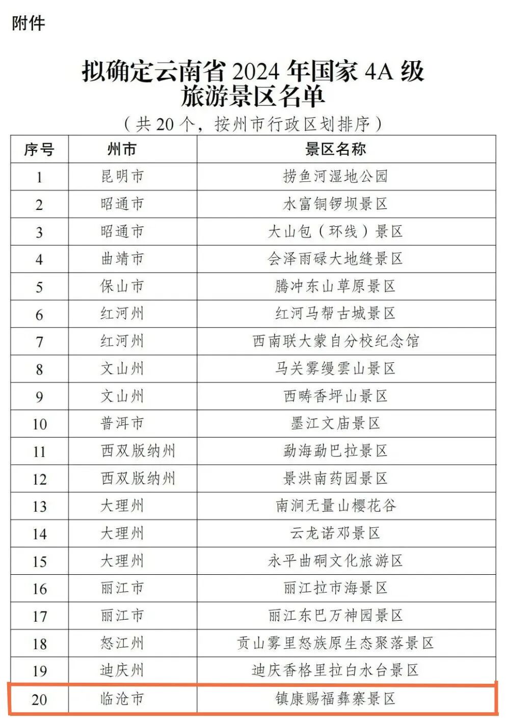 根据《旅游景区质量等级的划分与评定》(GB/T 17775-2003)国家标准和《旅游景区质量等级管理办法》要求,经各州(市)文化和旅游局初评、推荐,省文化和旅游厅按程序认真组织开展了2024年国家4A级旅游景区评定工作,昆明捞鱼河湿地公园等20家景区达到国家4A级旅游景区的标准,拟确定为国家4A级旅游景区。