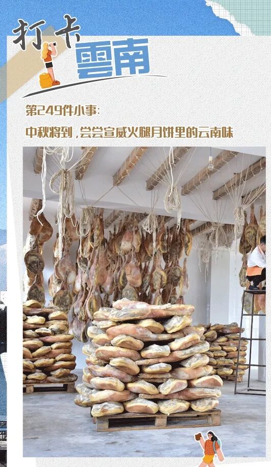 据介绍,每年冬至,宣威人就开始宰杀年猪,吃苞谷、洋芋、胡萝卜煮食长大的乌金猪,后腿肉质紧实,肥瘦相间,用盐反复揉搓后,挂在房梁下自然发酵。火腿在干燥的高原朔风下逐渐脱水,吸收大自然的精华,待到来年就发酵成熟。用这样的火腿加上传统工艺制作的月饼,酥香味正,入口难忘。