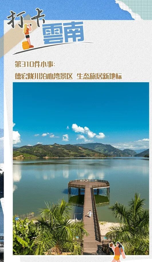 泊心湾景区位于德宏州陇川县勐约乡,群山蜿蜒起伏,周边生态系统类型多样,珍稀野生动植物资源数量众多,林木郁郁葱葱,绵长的龙江蜿蜒点缀其间,是集生态旅居、亲子体验、特色度假、休闲自驾于一体的旅游胜地。