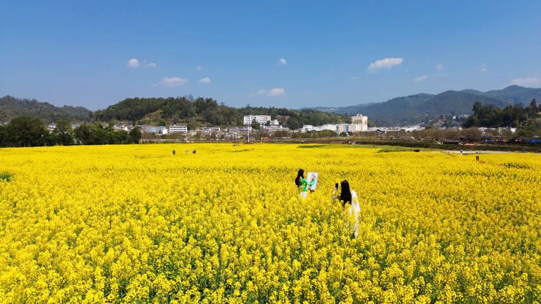 目之所及皆是一片灿烂金黄,大片大片的油菜花田,如同金色的波涛在田野间层层翻涌,将冬日的萧索一扫而空。花海中不时有蜜蜂和蝴蝶穿梭其中,它们忙碌的身影,更为这片花海增添了几分灵动与俏皮。