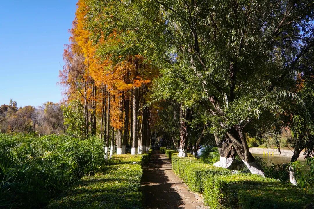 从大观公园大门向西继续前行,可进入到滇池绿道环草海段北片区。在这段绿道中,有着昆明“网红”打卡景点——干沟尾湿地公园的“天空之镜”。湿地内种植了很多高大树木,高高的树干直冲云天,树下草地中一条碎石小道穿插其间,一直向草海延伸。