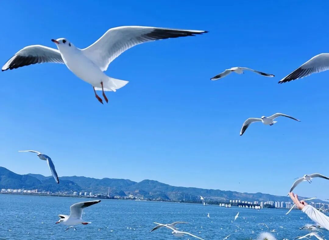 冬天,昆明的老朋友海鸥会不远千里而来。它们成群结队,或等待人们的投喂,或站在岸边、船顶,享受阳光的抚慰,或是在水面上悠然游弋,仿佛是在演绎一场自然界的和谐交响曲。