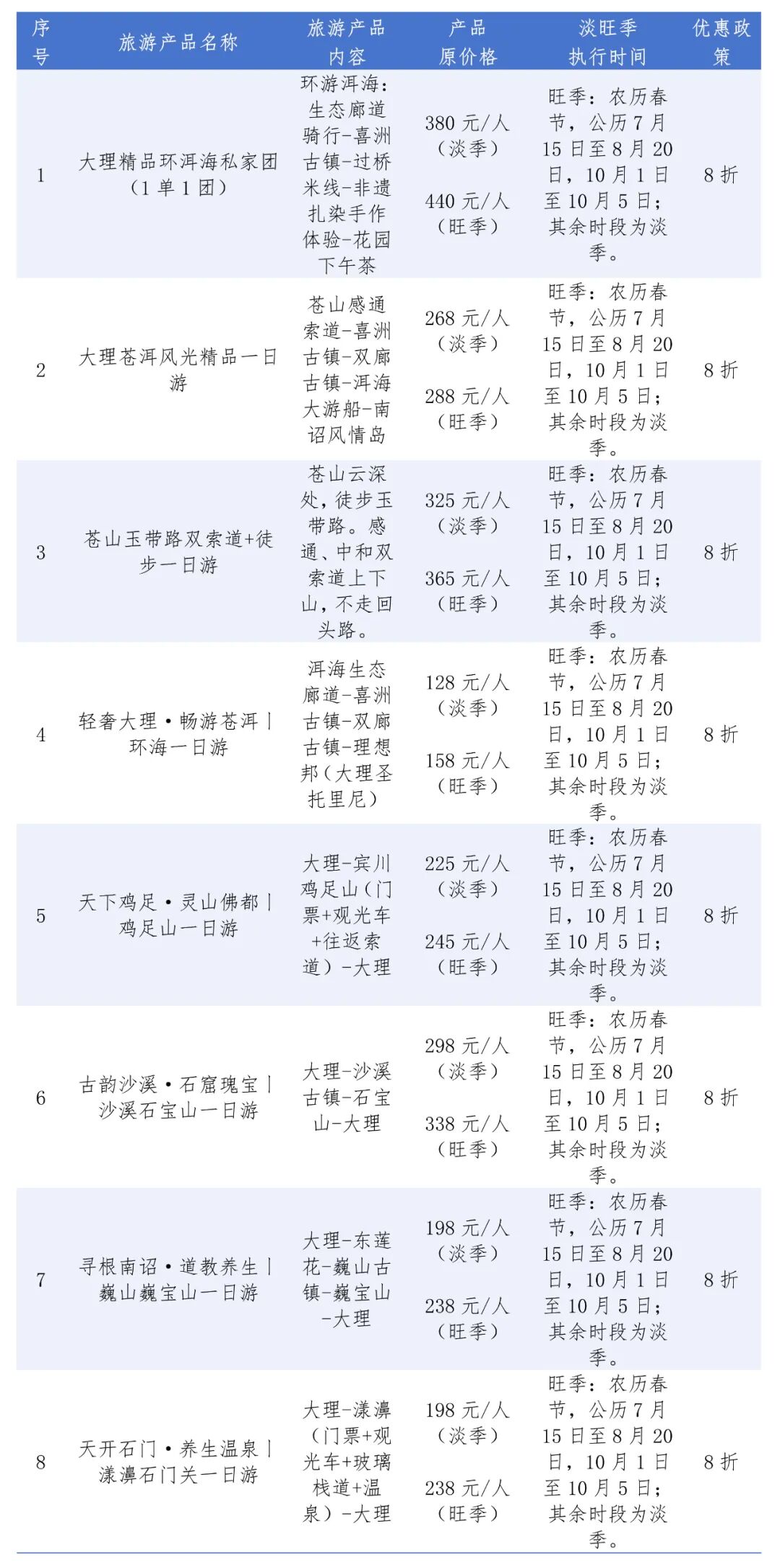 3.以上指导销售价格及优惠政策由大理白族自治州旅游行业协会旅行社分会提供,详细行程、价格可拨打服务热线咨询。