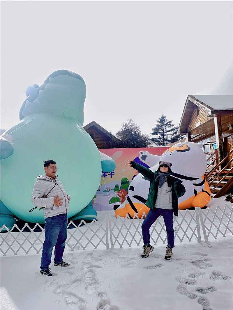 这个冬季,占地约6000平方米的戏雪乐园经过迭代焕新,正以崭新的姿态迎接游客的到来。据华侨城云南景区公司副总经理、轿子山公司董事长、总经理汤娜介绍,戏雪乐园包括自由娱雪区、冰雕馆、花溪草庐打卡出片区、雪地体验区等多片区域,游客不仅可以观赏冰雕艺术、拍照打卡大型动物主题气模和雪山玫瑰陈列,还能尽情体验雪地穿越、雪上飞碟、雪地挖掘机等游乐项目,感受冰雪运动的激情与刺激。
