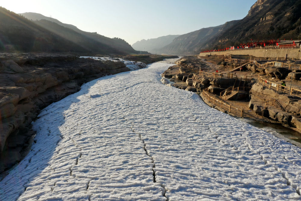 连日来,受持续低温天气影响,黄河中游晋陕峡谷流凌密度持续增大,位于山西吉县和陕西宜川县交界的黄河壶口瀑布段形成约10公里长的“流凌叉桥”奇特景观,冰桥连接黄河两岸,蔚为壮观,吸引不少游客前来观赏。(来源:新华社)