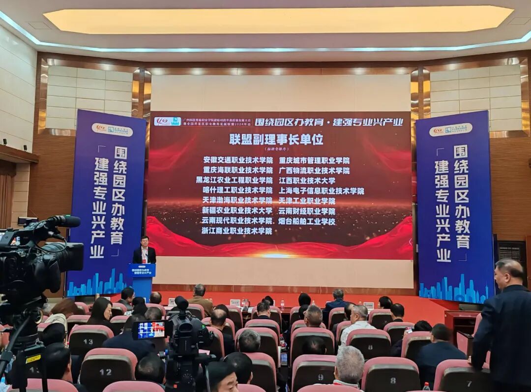2024年12月7日,全国开发区职业教育发展联盟2024年会在广州召开。会议由广州科技贸易职业学院承办、无锡科技职业学院协办。会议主题为“围绕园区办教育 建强专业兴产业”,相关政府部门领导、开发区协会负责人,联盟学校、企业、科研院所负责人,产业与职教领域专家学者等百余人齐聚一堂,分享了产业园区与职业院校高质量融合发展的成果与案例,探讨提升办学能力高水平、产教融合高质量的实践路径,云南现代职业技术学院被推选为联盟副理事长单位。