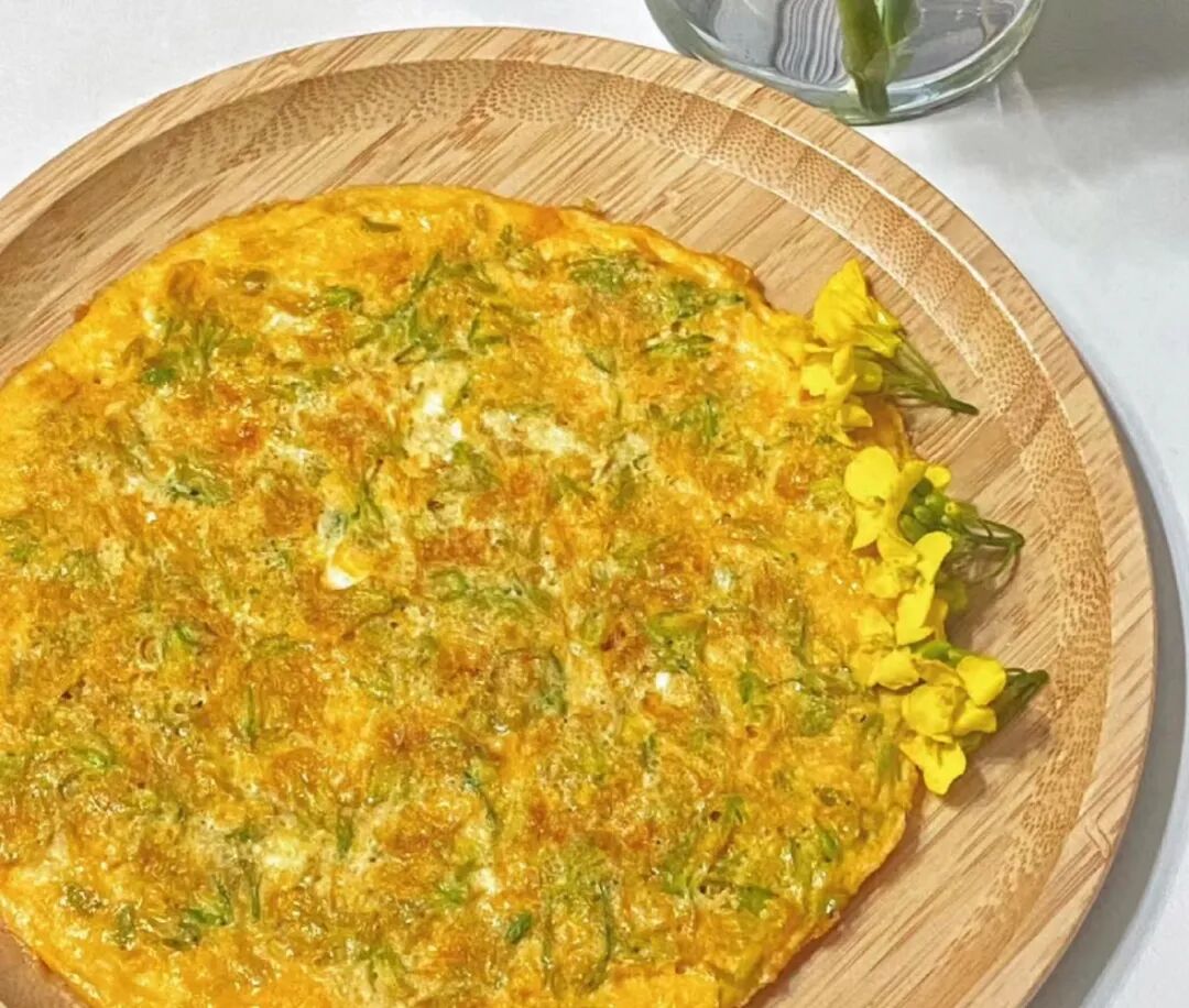 将新鲜的油菜花去掉茎秆,只留下娇嫩的花朵,然后倒入蛋液,用盐、胡椒粉调味后煎熟。这道菜色泽金黄,口感酥脆,是早餐或下午茶的绝佳选择。