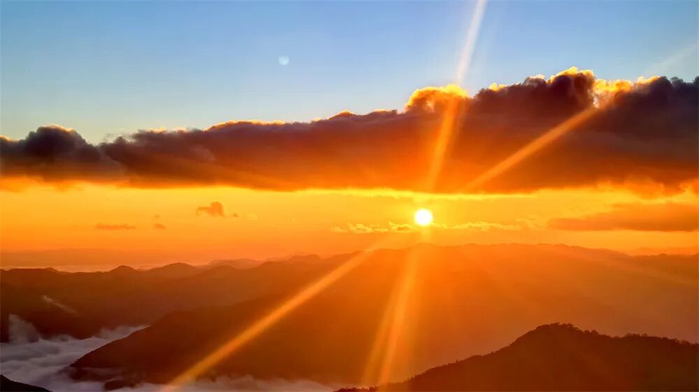 红日升腾出天边的山脊,霞光笼罩,绵延的山峦瞬间被染上了一层绚丽的色彩。待霞光洒满大地,将群山云海染成金色,整个世界都沐浴在这金色的光辉中。