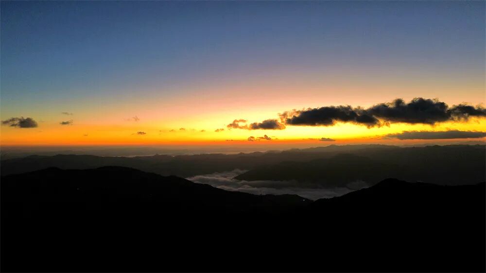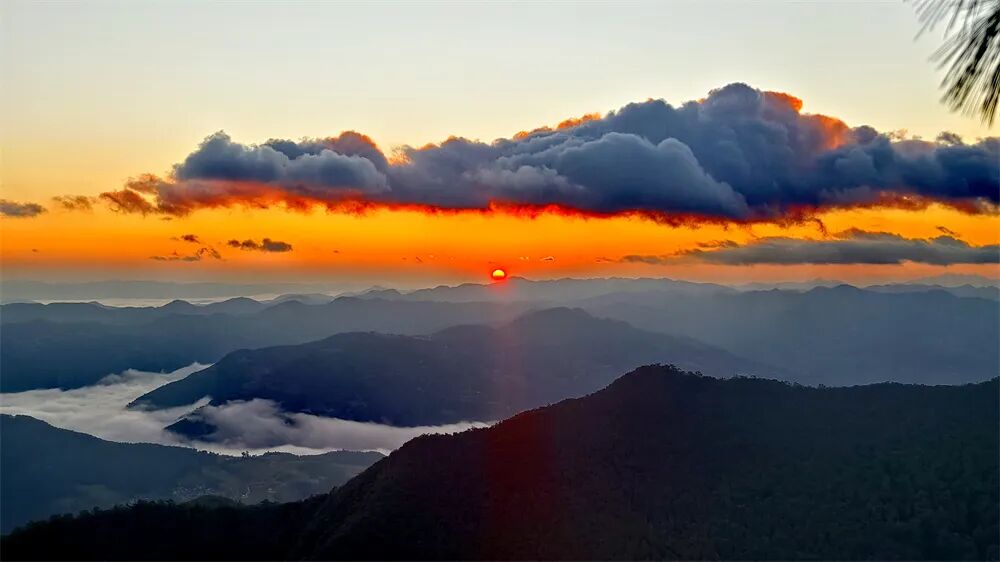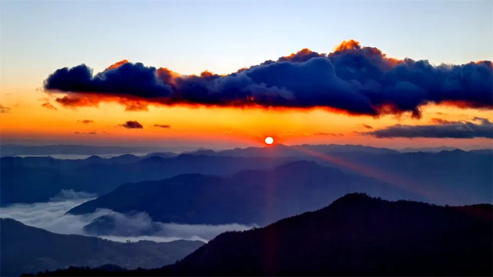 冬日晨曦,在云南省楚雄州楚雄市树苴乡三尖山,可以邂逅云海日出的壮美景观。天边太阳冉冉升起,橙红色的阳光、雪白色的云海和黛绿色的群山,瞬间构成一幅美丽的油画,引人遐想,令人回味。