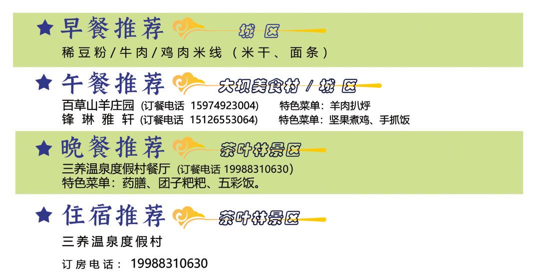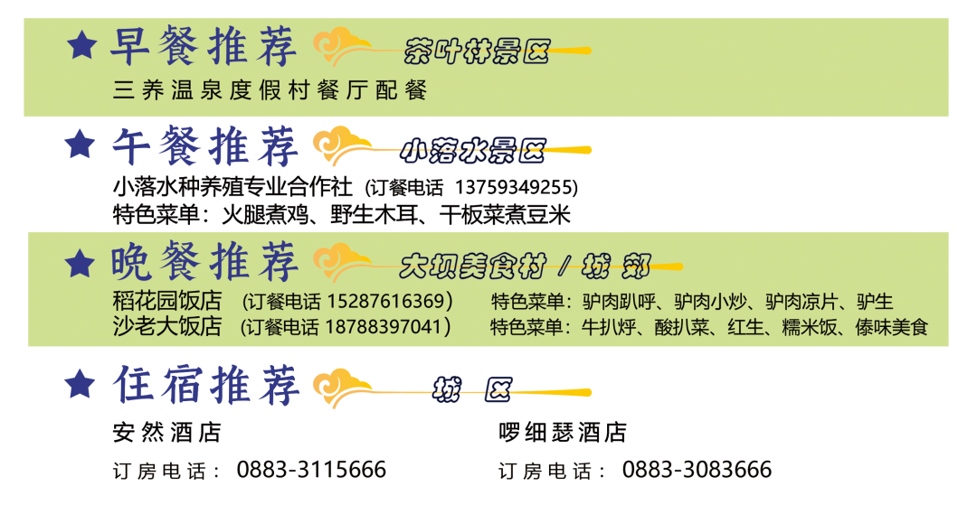 行程安排:从茶叶林景区前往小落水景区云巅石板村,观传统村落美景、瞻剿匪遗址、赏百亩草山、尝原生态火腿和黑蜂蜜、品手工咖啡,在景区吃山肴野蔌;返回县城南伞观河畔公园百草繁花,体验打陀螺和“阿数瑟”歌舞乐非遗传承的魅力,晚餐在县城或城边的大坝佤族村就餐;傍晚到广场感受有一种叫云南的生活夜间群众文化活动的热情。