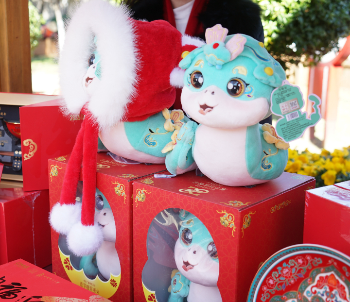 文创市集同样是本次活动的一大亮点。市集上,琳琅满目的文创产品吸引了众多游客驻足。蛇年春晚吉祥物巳升升玩偶、寓意美好的“春碗”,以及极具大理特色的扎染制品等,这些文创产品不仅是精美的春节装饰,更体现了传统与创新融合,深受游客青睐。