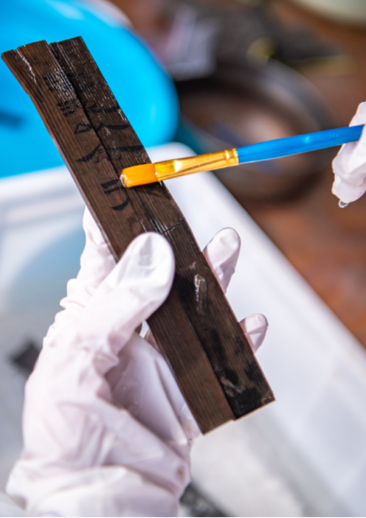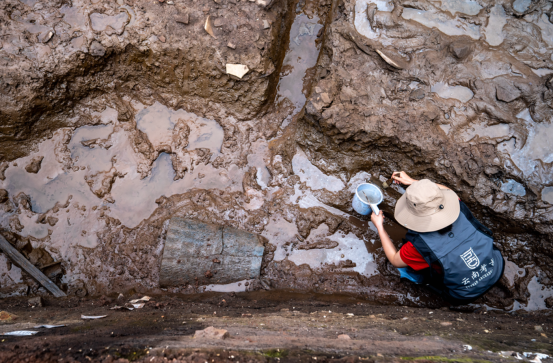 考古工作者在清理出土的简牍(摄于2022年9月21日)。(新华社记者 江文耀 摄)