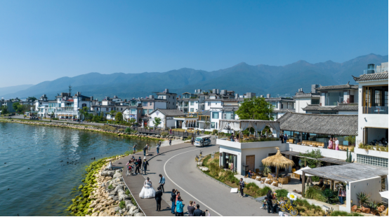 人们在大理市洱海边的生态廊道游玩。(新华社记者 胡超 摄)