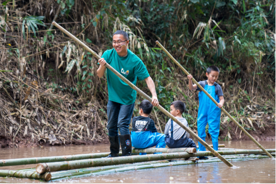 游客在基诺山雨林徒步路线沿途体验竹筏项目。(彭奕凯 摄)
