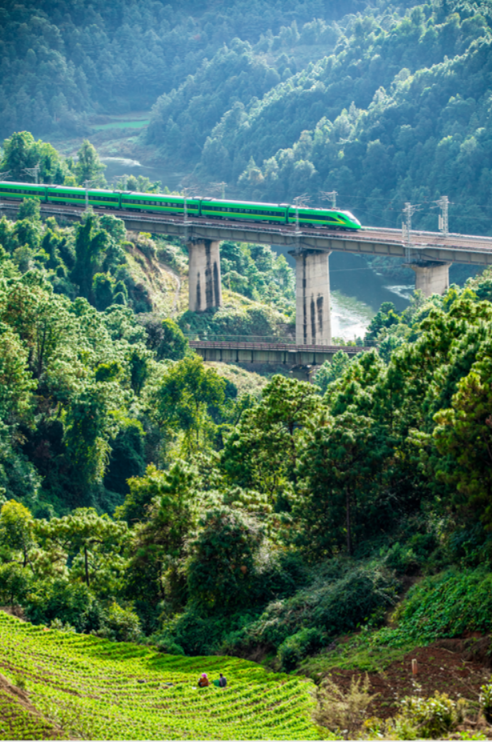 “复兴号”动车组列车奔驰在中老铁路线上。(何俊云 摄)