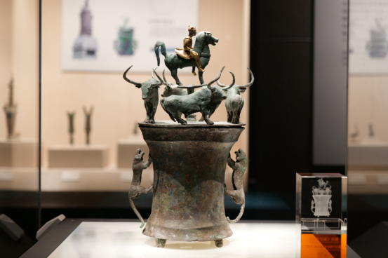 云南省博物馆馆藏文物四牛鎏金骑士铜贮贝器。(丁凝 摄)