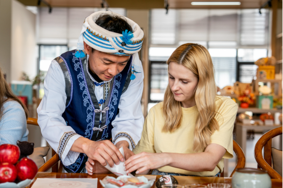 一名外国友人在大理市体验包装下关沱茶。(新华社记者 胡超 摄)