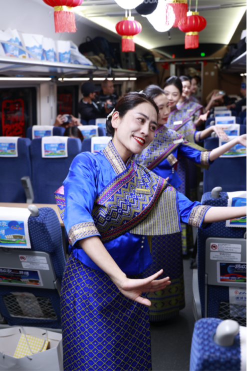 2025年春运首日,中老铁路旅客列车上开展了跨国文化联欢活动。(新华网 徐华陵 摄)