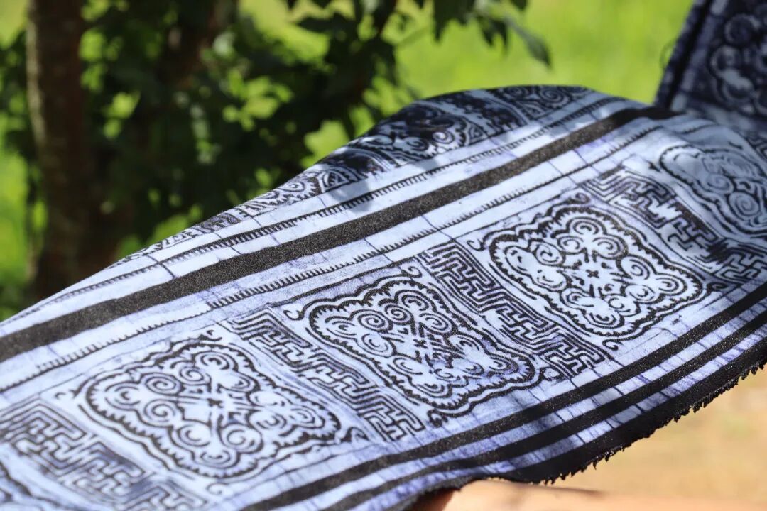 苗族民间传统的蜡染工艺历史久远,其过程较为复杂,先是用蜡把花纹点绘在麻、丝、棉、毛等天然纤维物上,随后放入适宜低温条件下染色的靛蓝染料缸中浸染。天然染料在织物上产生龟裂,色料渗入裂缝得到变化多样的色纹,晾干后将蜡洗去,图案便保留在织物上。