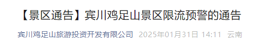 为保障游客合法权益,维护鸡足山景区旅游秩序和安全,营造舒适和谐的旅游环境。按照“限量、预约、错峰”的要求,结合景区实际,根据2025年春节期间(1月28日—2月4日)鸡足山景区日接待量的要求,2025年1月31日14:00分,鸡足山景区已接近日接待最大承载量,请计划到鸡足山的游客合理安排行程,感谢您的理解和配合,由此给您带来不便,敬请谅解!