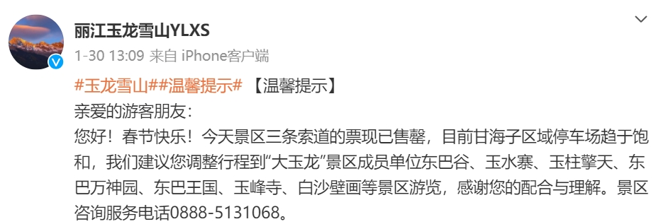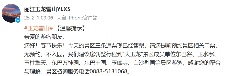 2025年2月1日—2月5日,玉龙雪山景区将在入园分时预约、分区游览和分片管控的基础上,综合研判玉龙雪山景区每日天气实况、交通状况、停车场容量、实时游客接待量和瞬时承载量后,提前在官方微博发布相关提示,适时对未提前预订景区各类票种且尚未进入景区的游客采取分流、控流和限流等疏导措施,确保景区游客流量控制在安全有序范围内。