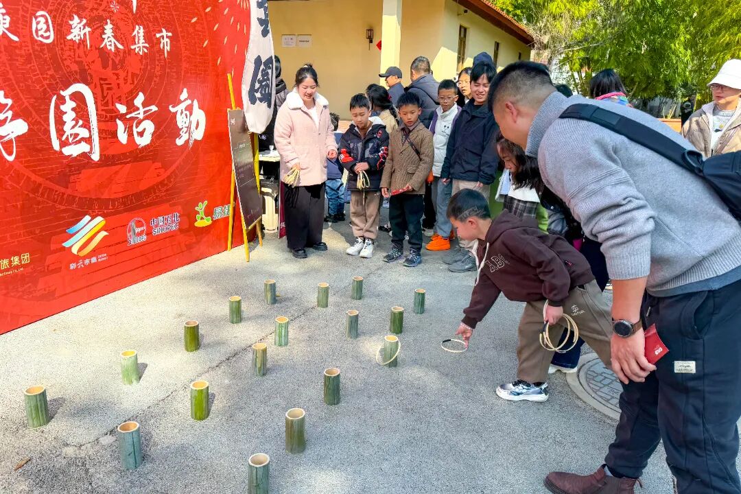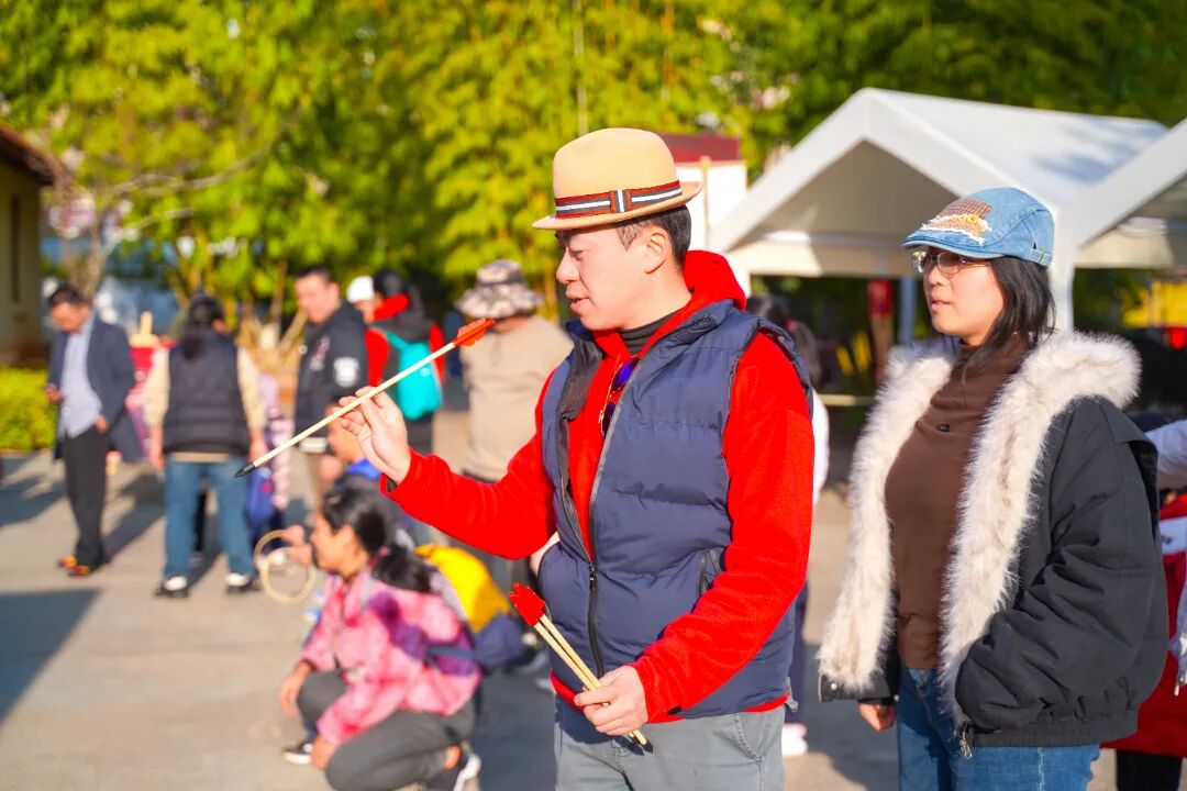 新春市集活动的游戏环节丰富多彩,精心设置了投壶、射箭、滚铁环、拍洋画等一系列充满儿时记忆的趣味游戏。参与者们热情洋溢,纷纷投身其中,重拾童年的快乐时光。