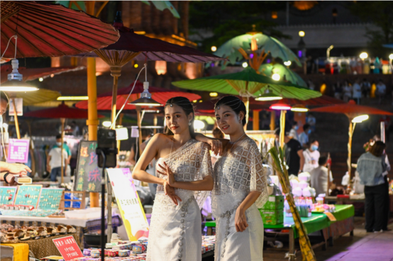 游客在西双版纳傣族自治州告庄西双景的星光夜市体验“变装”旅拍 新华社记者 曹梦瑶 摄