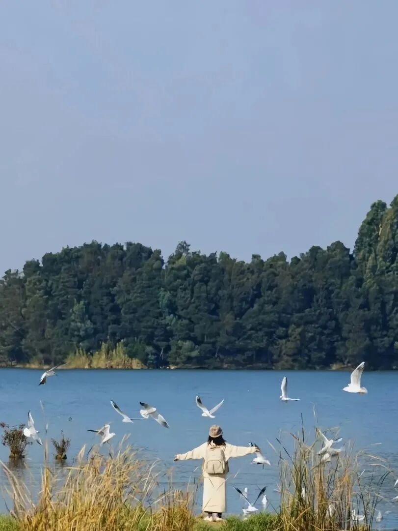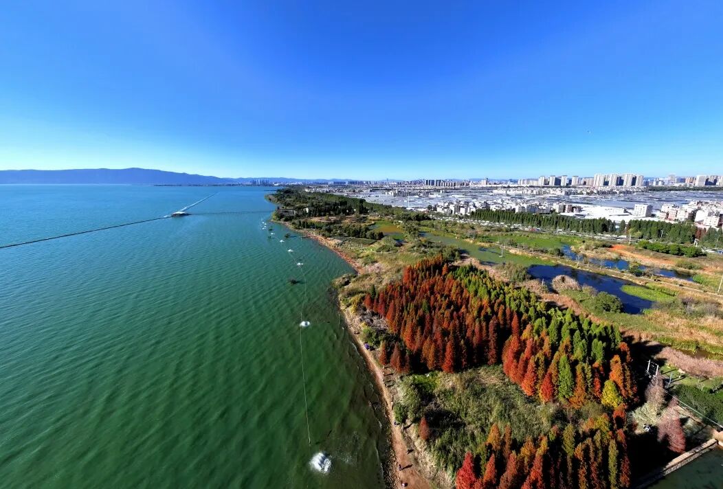 湿地靠近滇池,远眺西山,沿岸水杉密布,依托湖光山色之景,成为一个松弛感拉满的“天然氧吧”。一到冬日,公园内成片的水杉一片火红,红嘴鸥也如约而至。湿地内可乘船,搭帐篷,野餐,也有餐厅和咖啡馆,给周末漫步于此的市民增添别样浪漫。
