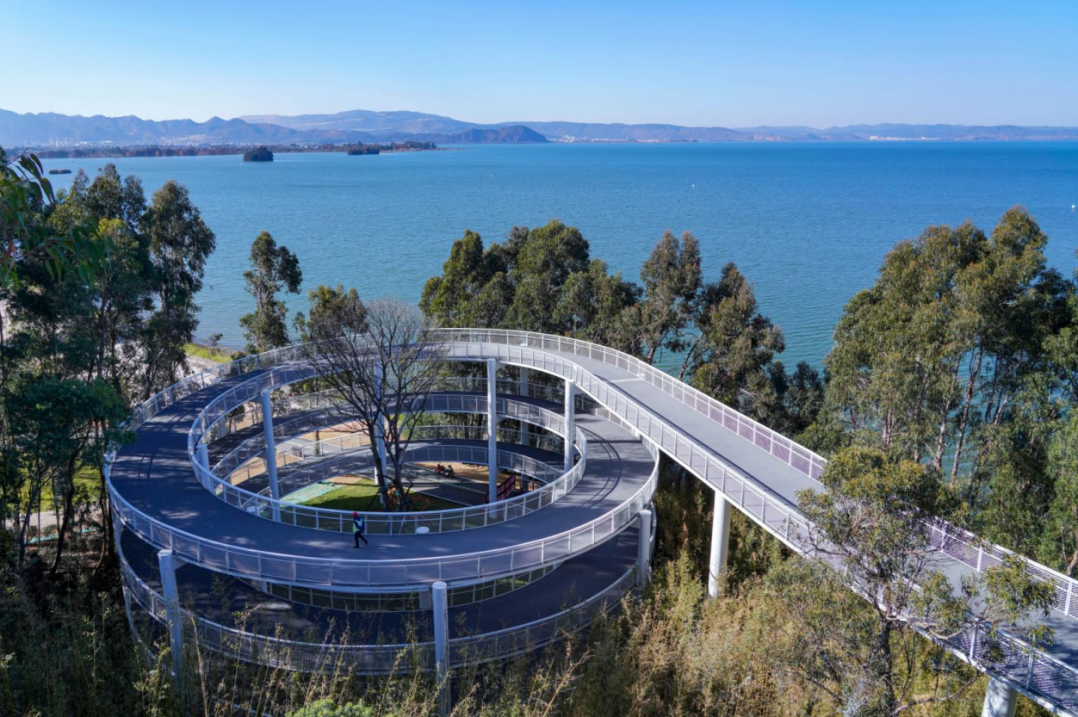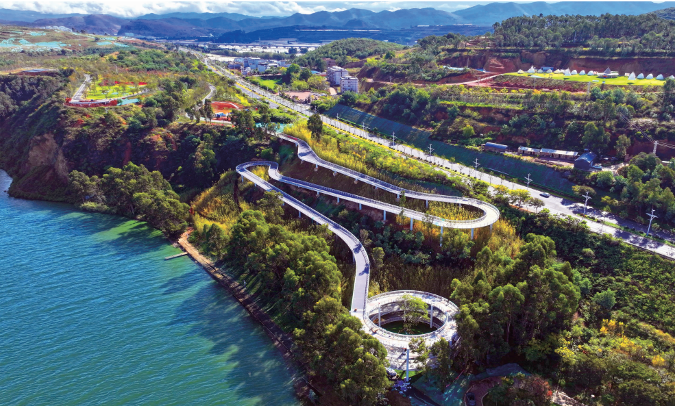 此外,滇池绿道(外海段)还建设了以“七彩云桥”为主题的13座特色栈桥,根据立地条件和景观特色分别打造了“山、水、林、田、湖、草、村”7个主体栈桥,再搭配众多特色桥梁和绿道,贯穿滇池周边区域,将自然风光、生态保护与人文景观完美融合。