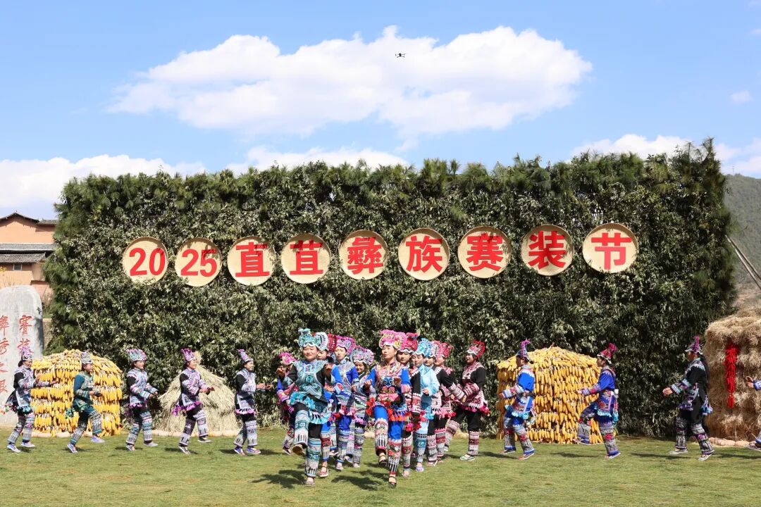 直苴村是“赛装之源、彝绣之根”,直苴彝族赛装活动传承了1350余年。赛装场上,爷爷赛装队、奶奶赛装队、汉子赛装队、妈妈赛装队、姑娘赛装队和娃娃赛装队依次上场,踏着欢快的歌声跳起脚来,彩裙飞扬、纵情欢歌,在山野间上演了一场大型民族服装秀。彝族传统服饰走秀汇聚了楚雄州各县(市)的彝族传统服饰,全方位展示了彝族服饰的厚重文脉和令人惊叹的完美蝶变,诉说着彝族文化的传承与发展,表达了彝家人心中的喜悦和对美好生活的歌颂。