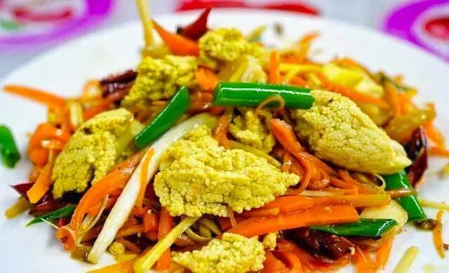 石榴花是经常见到,但很多人却没吃过的花,其实吃起来非常特别,清爽可口、香气扑鼻。炒石榴花所用的花朵,不是新鲜的石榴花,而是把新鲜石榴花的花蕊去除,主要保留它的花瓣部分,用开水烫一下,清水冲洗浸泡2天才可食用。