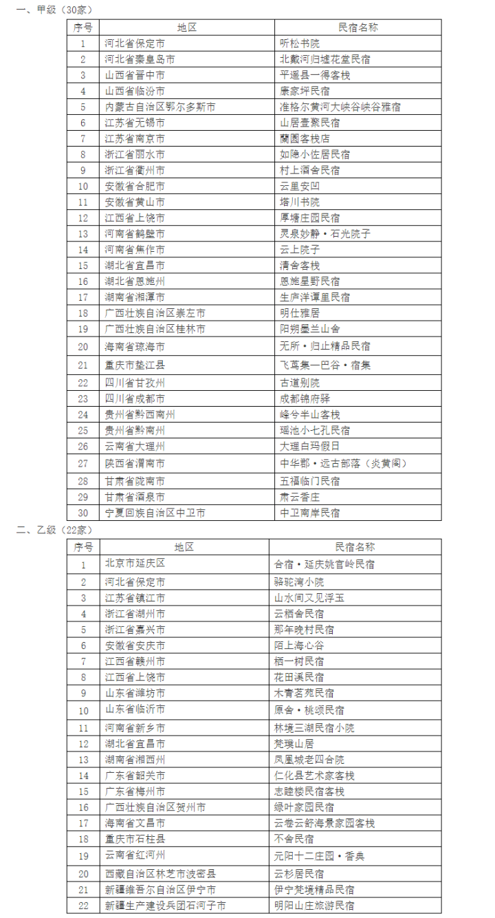根据《〈旅游民宿基本要求与等级划分〉(GB/T 41648-2022)实施工作导则》,经复核,2021年评定的首批全国甲级、乙级旅游民宿中,30家旅游民宿符合全国甲级旅游民宿标准,22家旅游民宿符合全国乙级旅游民宿标准,3家未通过复核取消相应等级,1家延期复核。通过复核的民宿具体名单如下: