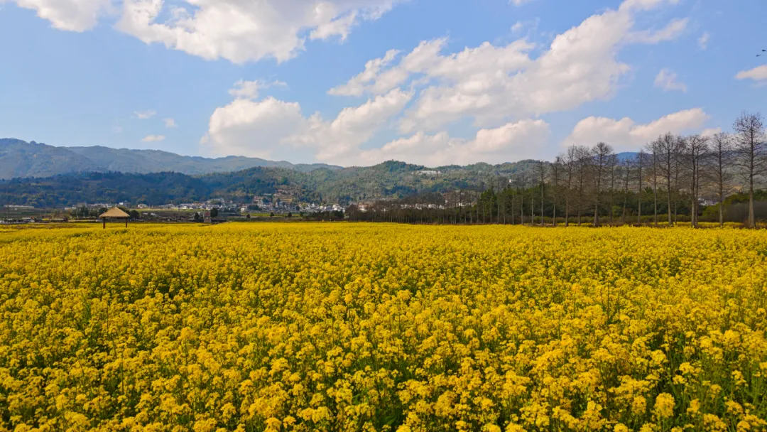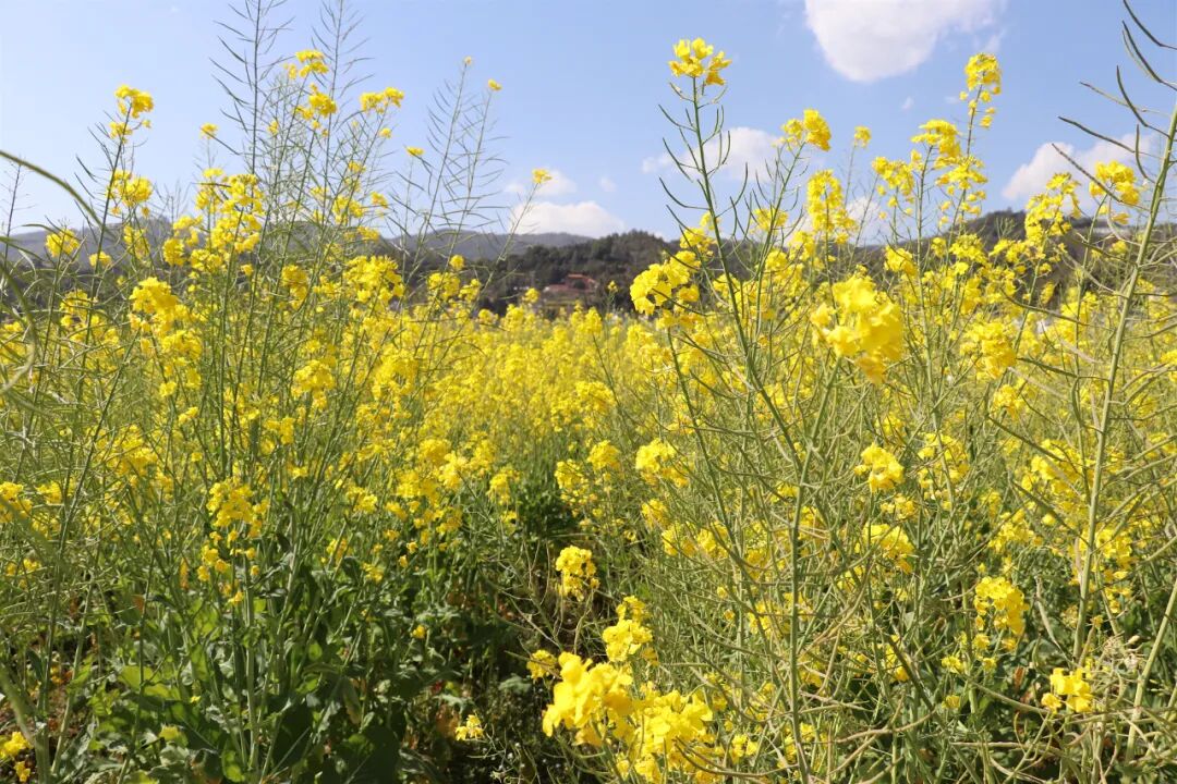 随着油菜花迅速生长,装点出一片金色海洋。微风拂过,花浪层层翻涌,每一朵油菜花都宛如小太阳,空气中弥漫着清新甜香,让人沉醉其中,忘却尘世纷扰。