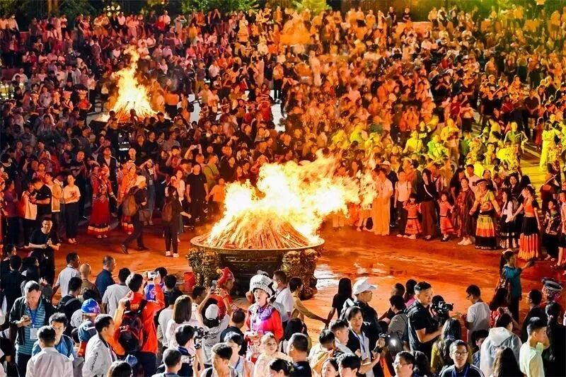 白族扎染坊里,阿嬷用板蓝根染出苍山云纹;纳西古乐千年曲谱流淌《白沙细乐》的沧桑;独龙江文面女的图腾皱纹凝固未被篡改的文明密码。彝族火把节撕裂黑夜的篝火,傣族泼水节飞溅的祝福。