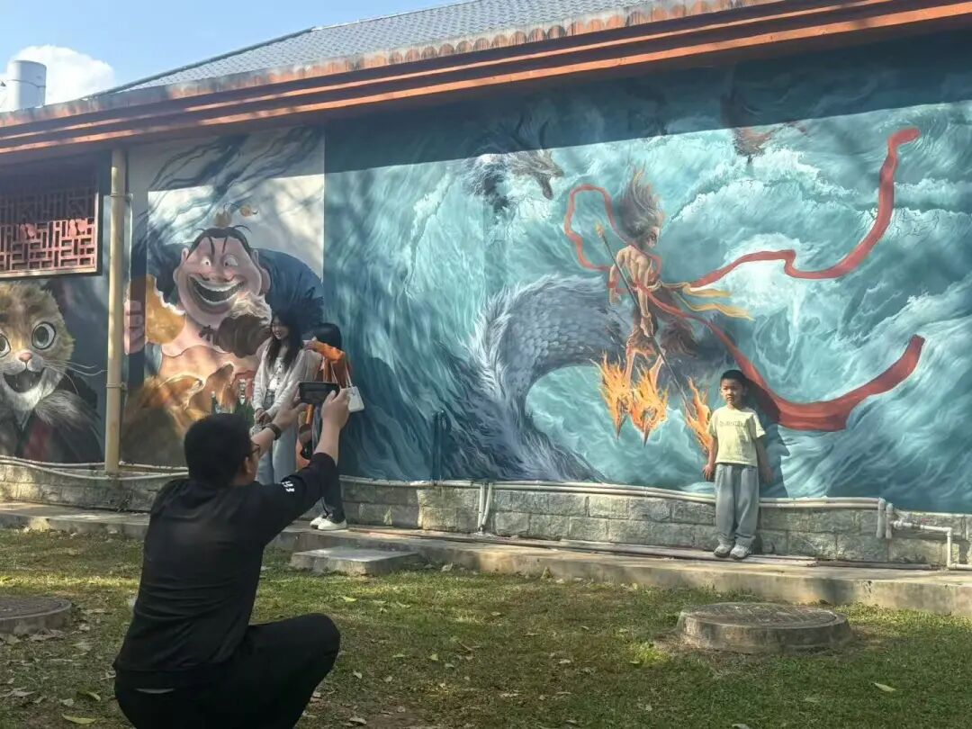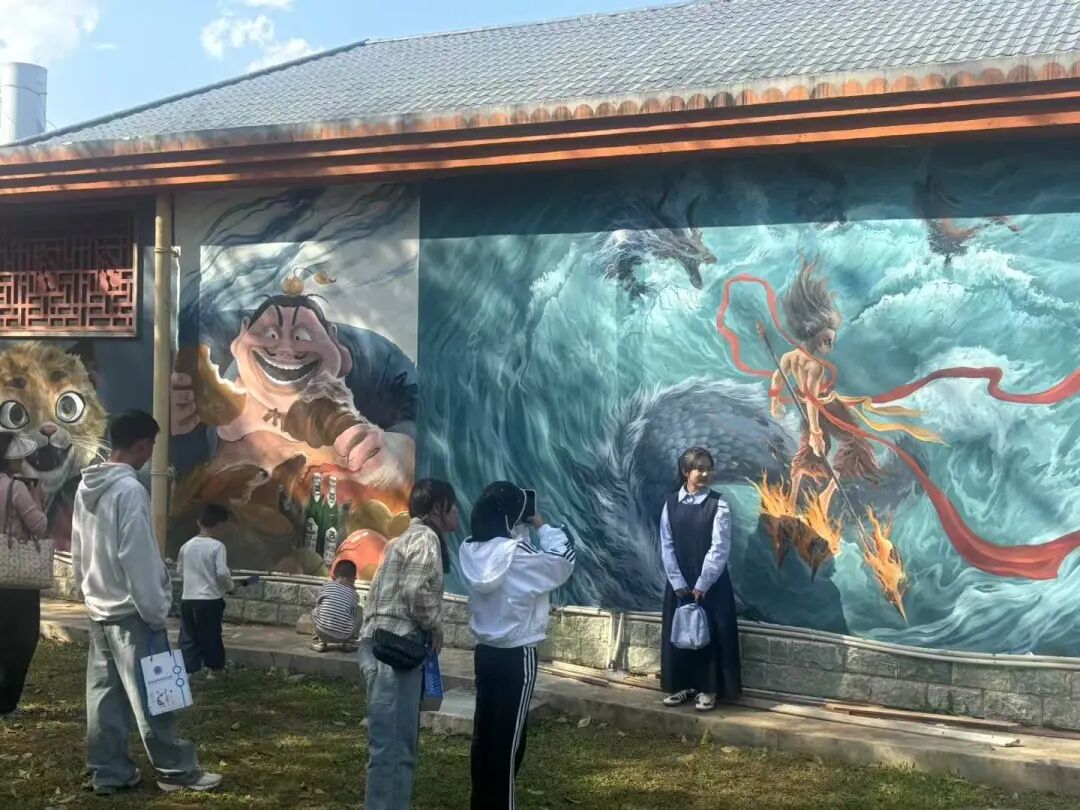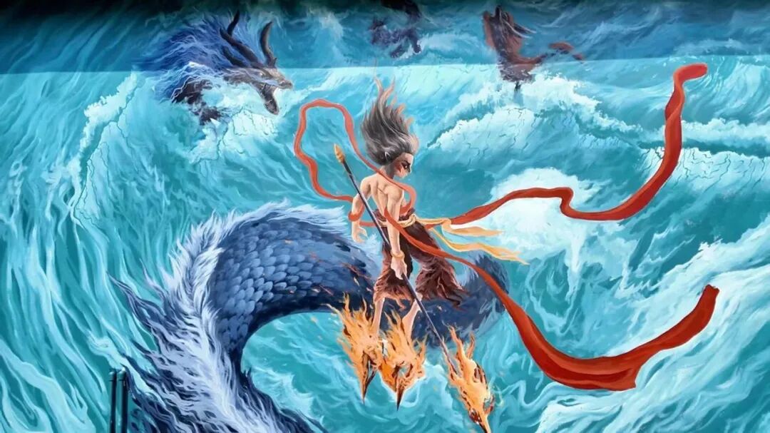 当《哪吒2》的票房旋风席卷全国时,临沧市文化和旅游局与木岳艺术坊联手玩出"神仙操作"——让踩着风火轮的哪吒"空降"玉龙湖十字路口!6米高的墙面上,身披混天绫的少年神仙正与临沧茶山云海共舞,传统剪纸风格的敖丙龙鳞在阳光下折射出七彩光芒,连交通信号灯都被巧妙设计成"山河社稷图"中的法宝造型。