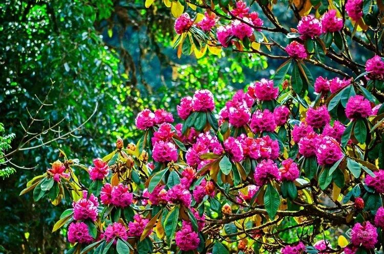 二月至五月,大树杜鹃率先在高黎贡山绽开笑颜。这一时节,在腾冲东山草原近十里的山林中,满树花开,成千上万朵挤挤挨挨,气势壮观,一团团雍容华贵的血红花朵立在风中,以王者气势迎接春天。