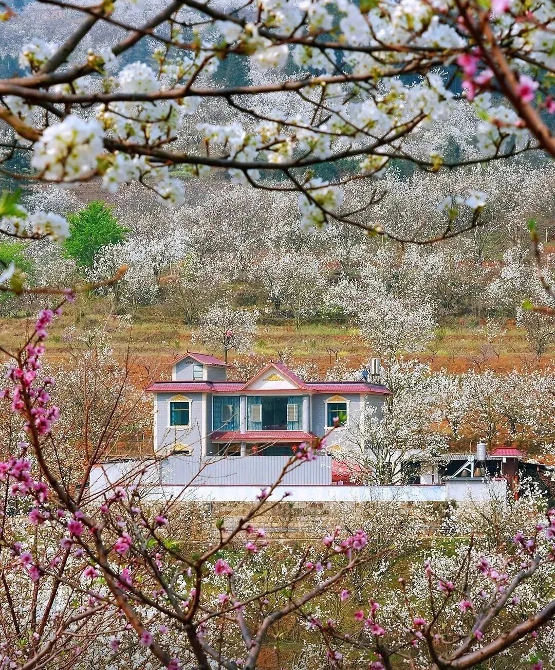 在加级寨梨花谷山顶极目远眺,满山梨花争奇斗艳,动人的雪白已成了山间田野的主色调。漫山遍野的梨花和村屋、红土地相互映衬,好似“梨花飘雪”盛景。
