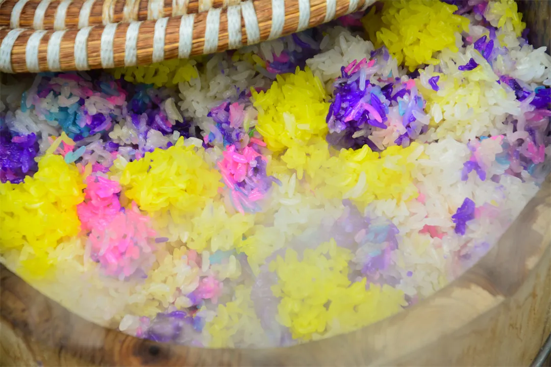 五色花米饭,饭如其名,共有红、黄、紫、黑、白五种颜色,五彩斑斓,令人心生喜爱,而这丰富的色彩更寓意着五谷丰登,饱含着当地人对美好生活的向往与祈愿。
