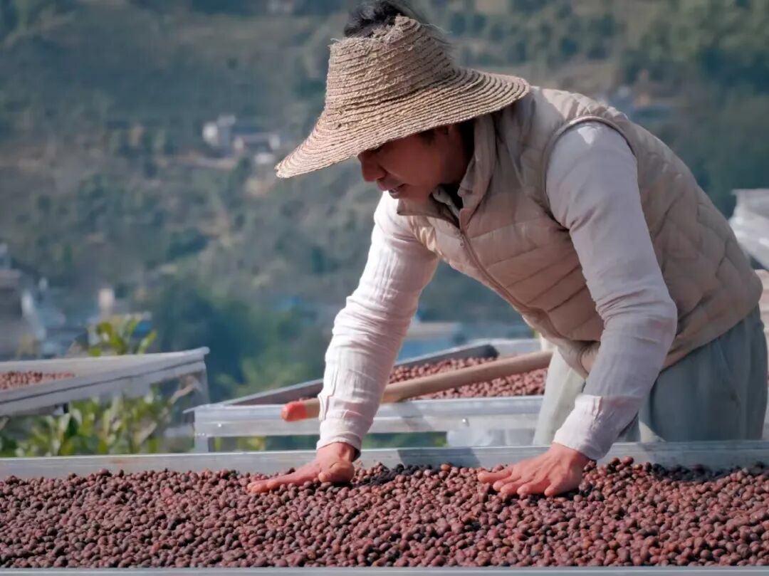 农人的草帽在咖啡林间若隐若现,像移动的褐色蘑菇。他们用古茶树传授的智慧,教咖啡与核桃树互致叶语。遮荫网原是多余的,横断山脉自有分寸——光斑筛过层层叠叠的阔叶,恰好够青果酿出七分酸三分甜。瓢虫在阴凉处看守蚜虫,发酵池里的果胶正与时间进行形而上的辩论。