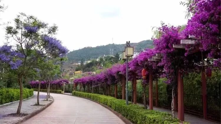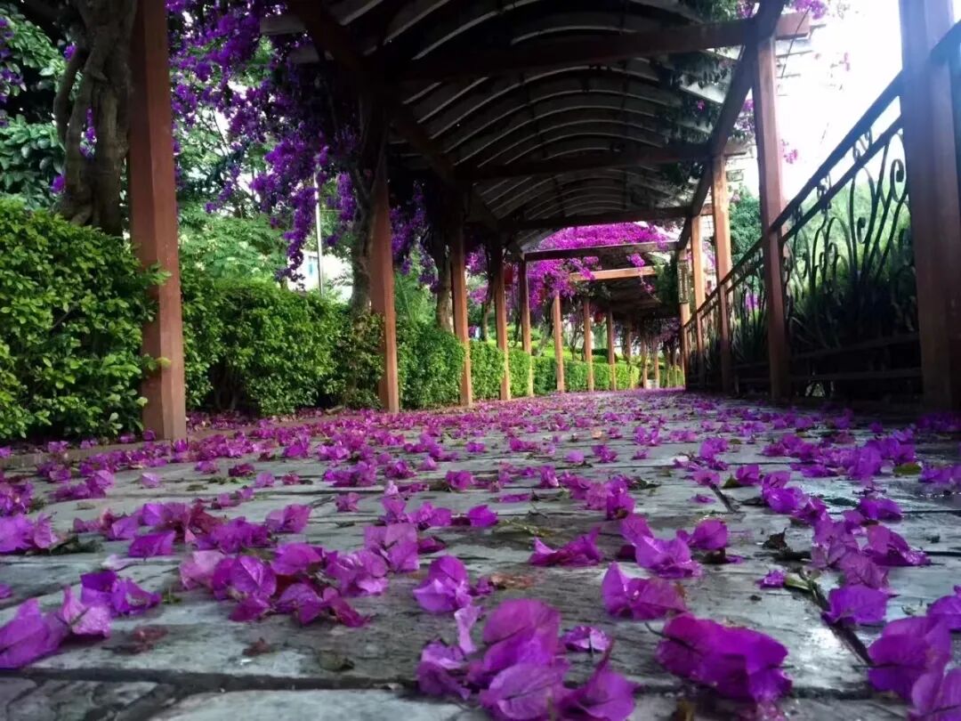 小城之中,最为盛名的是贯穿县城的长廊,三角梅爬满长廊,枝繁叶茂,常开不谢。