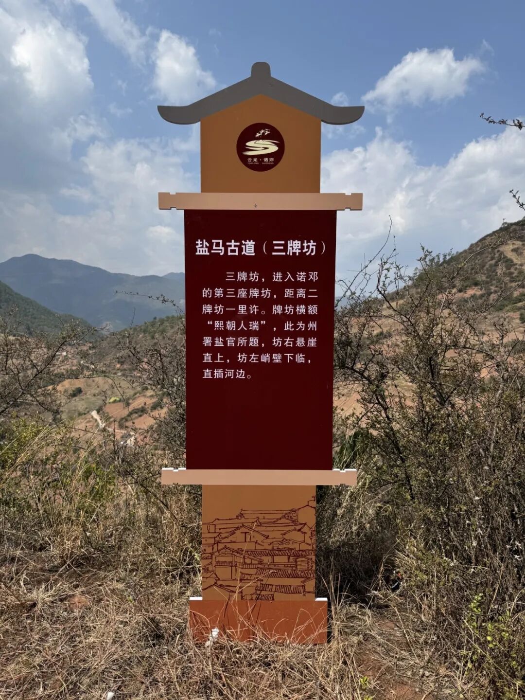 三牌坊,进入诺邓的第三座牌坊,距离二牌坊一里许。牌坊横额“熙朝人瑞”,此为州署盐官所题,坊右悬崖直上,坊左峭壁下临,直插河边。
