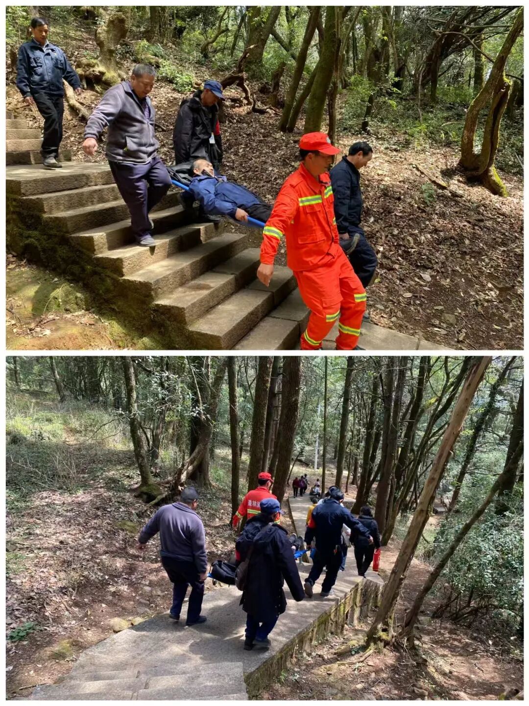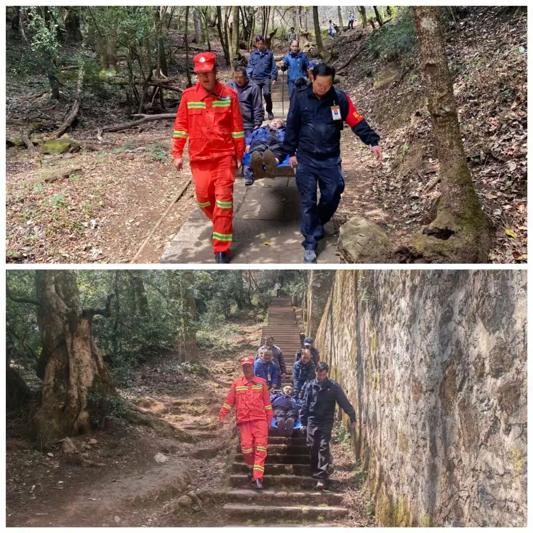 12时15分,救援人员突破陡坡石阶抵达现场。救援组由索道经营部、观光车经营部、景区综合管理部、消防中队工作人员组成。6名健硕的担架员稳步前行,在仅容两人并行的山道上,他们的后背早已被汗水浸透。与此同时,观光车司机已做好准备接应。