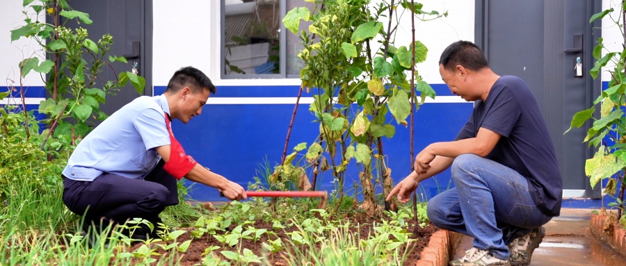 走进永仁县猛虎派出所,院内翠绿的黄瓜藤攀着竹架,紫茄挂满枝头,几位民警正和村民一起弯腰除草,笑语阵阵。据悉,2025年初,猛虎派出所民辅警将70余平方米的闲置空地开垦为“暖心试验田”。从向农户请教选苗育苗技术,到亲手翻土施肥,茄子、黄瓜、玉米等时令蔬菜在警民共同照料下茁壮成长。民警们利用村民前来打理菜园、领取免费蔬菜的契机,开展反诈宣传,还将蔬菜作为“流动爱心菜篮”,由民警为行动不便的老人送菜上门,实现了“你挥锄头我普法”的双向奔赴。永仁县猛虎派出所民警彭哲说:“这个小菜园是我们警民一起打造的,刚开始我们还邀请村民来传授我们种植的技巧,到后期村民就自发地来到小菜园帮我们打理。刚好利用这个契机对村民进行反诈知识宣传,在这种和谐的关系当中,无形地提高了村民的反诈意识。”