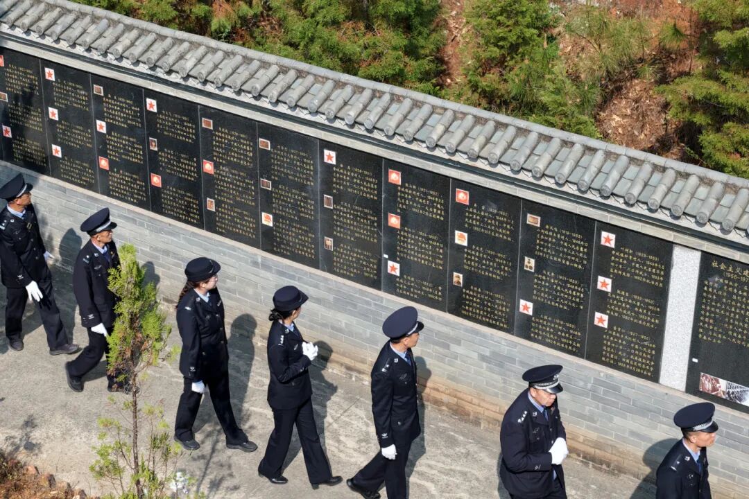 (晋宁公安分局民警瞻仰烈士纪念墙。胡妤雅 摄)